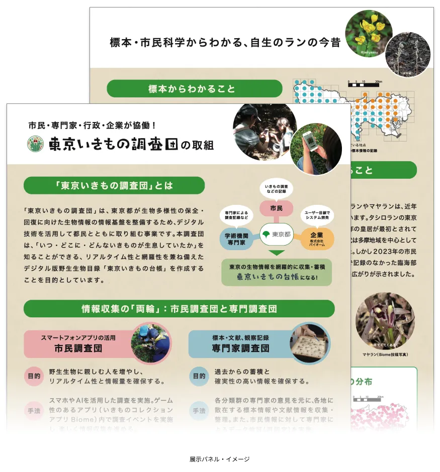 独立行政法人国立科学博物館 筑波実験植物園が主催する企画展 「つくば蘭展」にて、東京いきもの調査団や東京いきもの台帳の取り組みを紹介するパネル展示を行います。