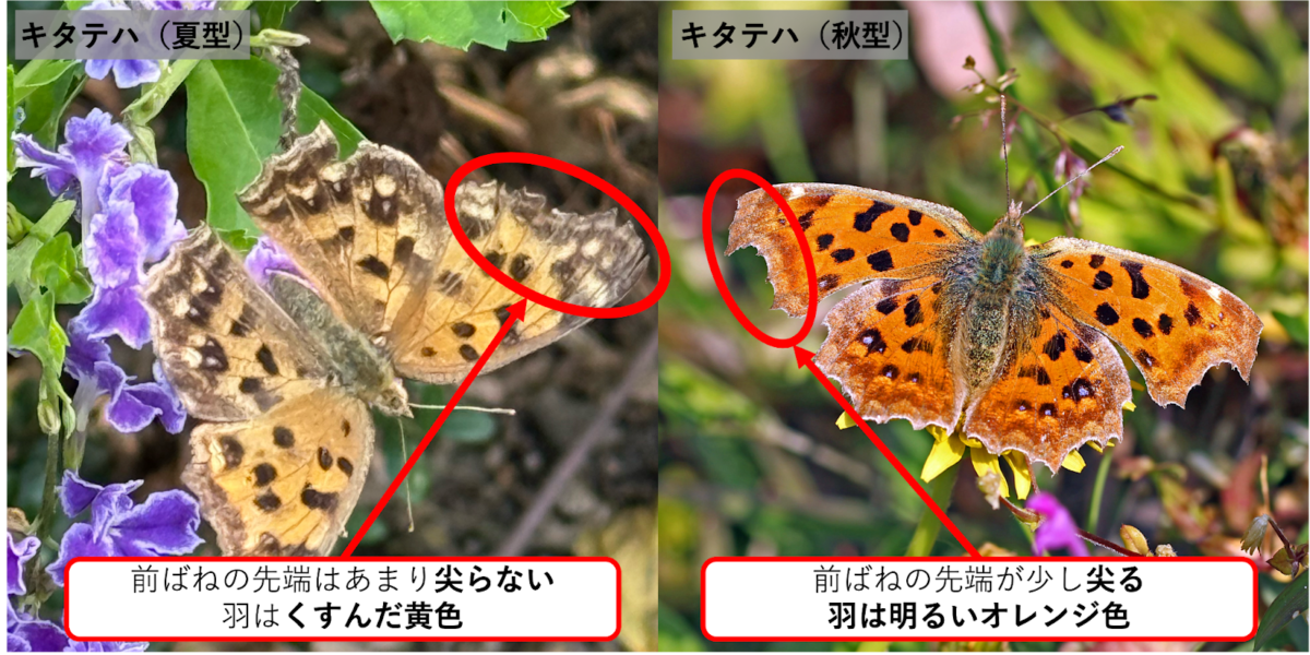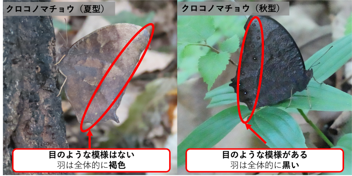 夏型は、翅の裏に目のような模様がはっきり現れます。秋型は、翅の裏が枯れ葉にそっくりな模様となり、蛇の目の模様はなくなります。翅の先端が鋭く尖ることで、枯れ葉への擬態力を高めています。