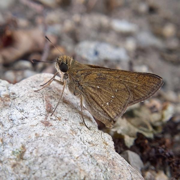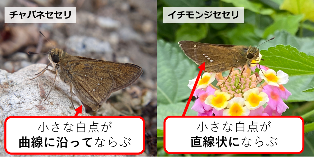 チャバネセセリは後翅の白点が小さく環状に並び、イチモンジセセリは後翅の白点が直線上に並ぶ点で見分けることができます。