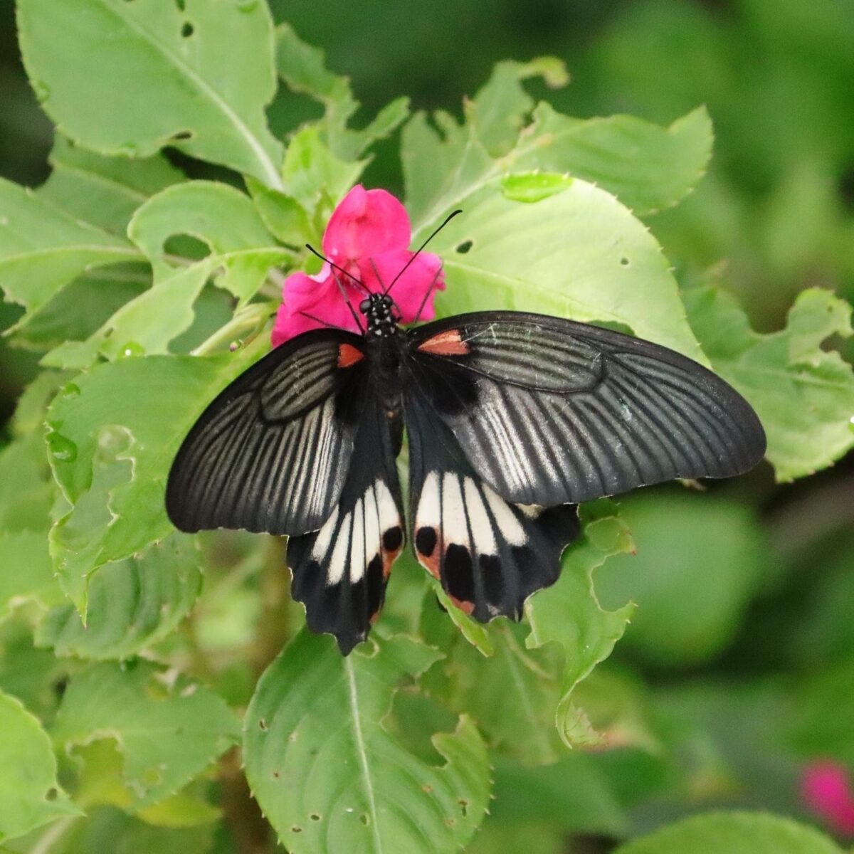 大型で黒い羽が美しいアゲハチョウの仲間です。オスとメスで翅の模様が異なり、オスはほぼ真っ黒ですがメスは白い部分が多くなります。東洋の熱帯・亜熱帯を中心に温帯まで広く分布しており、日本が分布の北限にあたります。近年の地球温暖化による気温上昇に伴い生息域を北に拡大しており、都内でも徐々に確認数を増やしています。