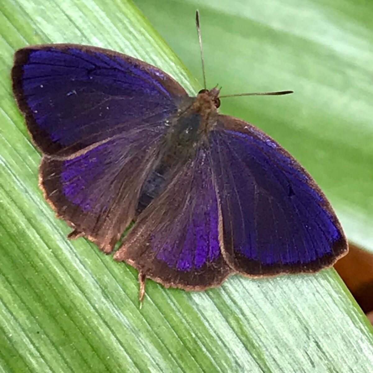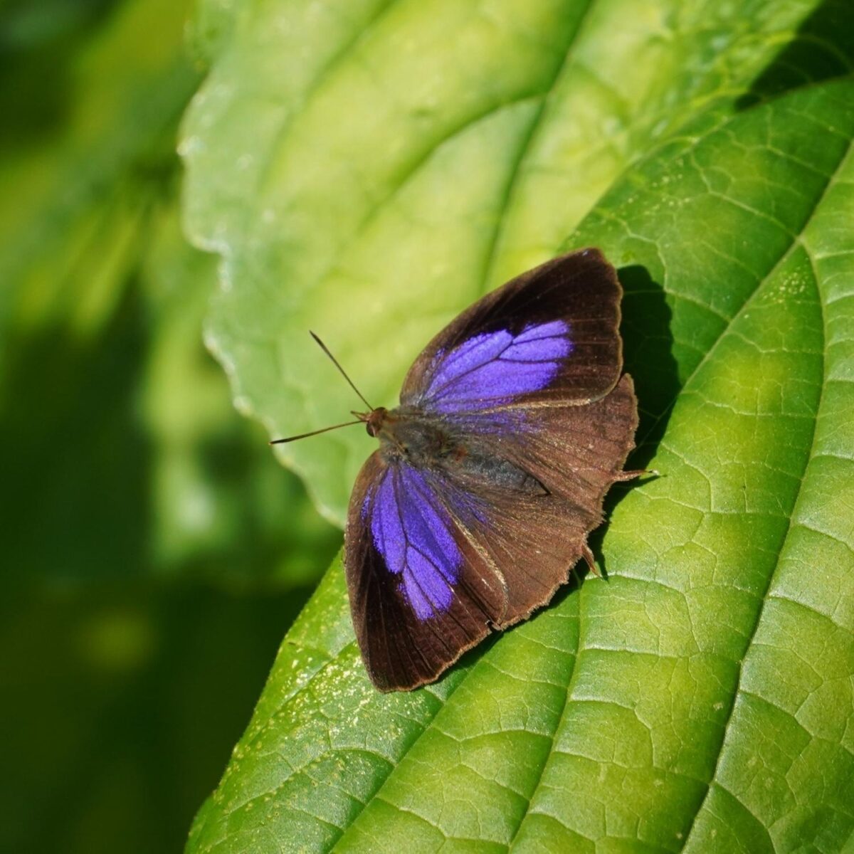 翅の裏は地味な褐色をしていますが、翅の表は紫色で、特にメスで鮮やかです。オスでは個体によって異なり、青黒い色〜暗い紫色をしています。過去の採集データから、年に複数回発生していることが示唆されており、晩秋まで見られます。ナガサキアゲハと同様、近年の地球温暖化による気温上昇に伴い生息域を北に拡大しており、都内でも徐々に確認数を増やしています。