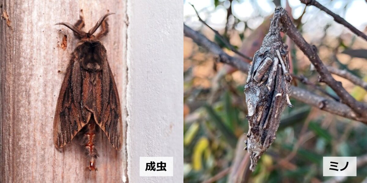 メスの成虫には羽がなく、一生をミノの中で過ごすことが知られています。一方、オスの成虫は夕方に飛び立ち、メスと交尾します。幼虫の時期には、街路樹や植え込みの葉を食べている姿が観察できます。