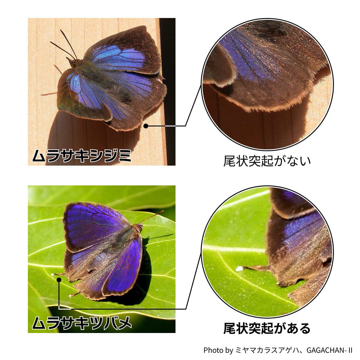 似ている種類にムラサキシジミがいますが、尾状突起の有無で区別することができます。